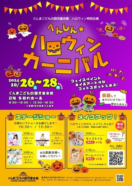 ぐんまこどもの国児童会館で、ハロウィン特別企画「へんしんハロウィンカーニバル」を、10月26日・27日・28日の3日間限定で開催。