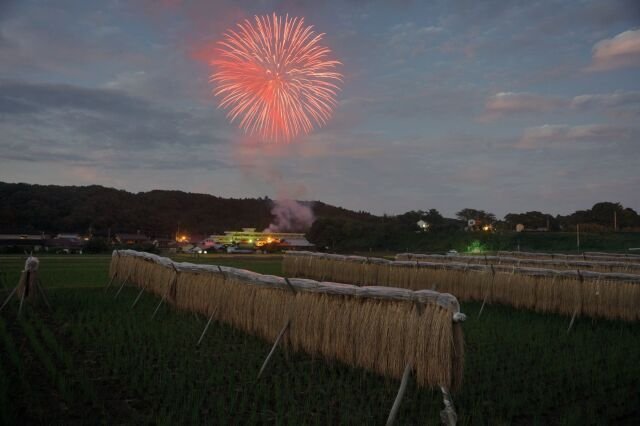 大子町の美しき原風景に、週末ごとに会場を変えて5分間の花火が打ち上げられる。田園や久慈川を舞台にしたノスタルジックな花火は必見。