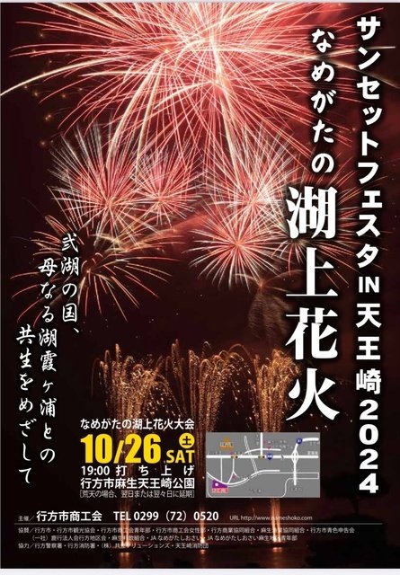 霞ヶ浦湖上で開催される花火大会。湖にせり出した地形により湖岸を一望できる天王崎公園では、晴れた日の夕方にはオレンジ色染まる空と霞ヶ浦、そして筑波山も見ることができる。