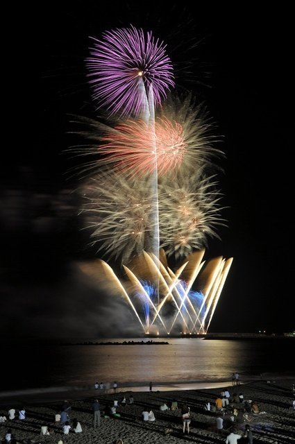 尺玉や海上スターマイン、ユニークな創造花火などが打ち上げられ、心地よい潮風と波の音を聴きながら観る花火は格別だ。