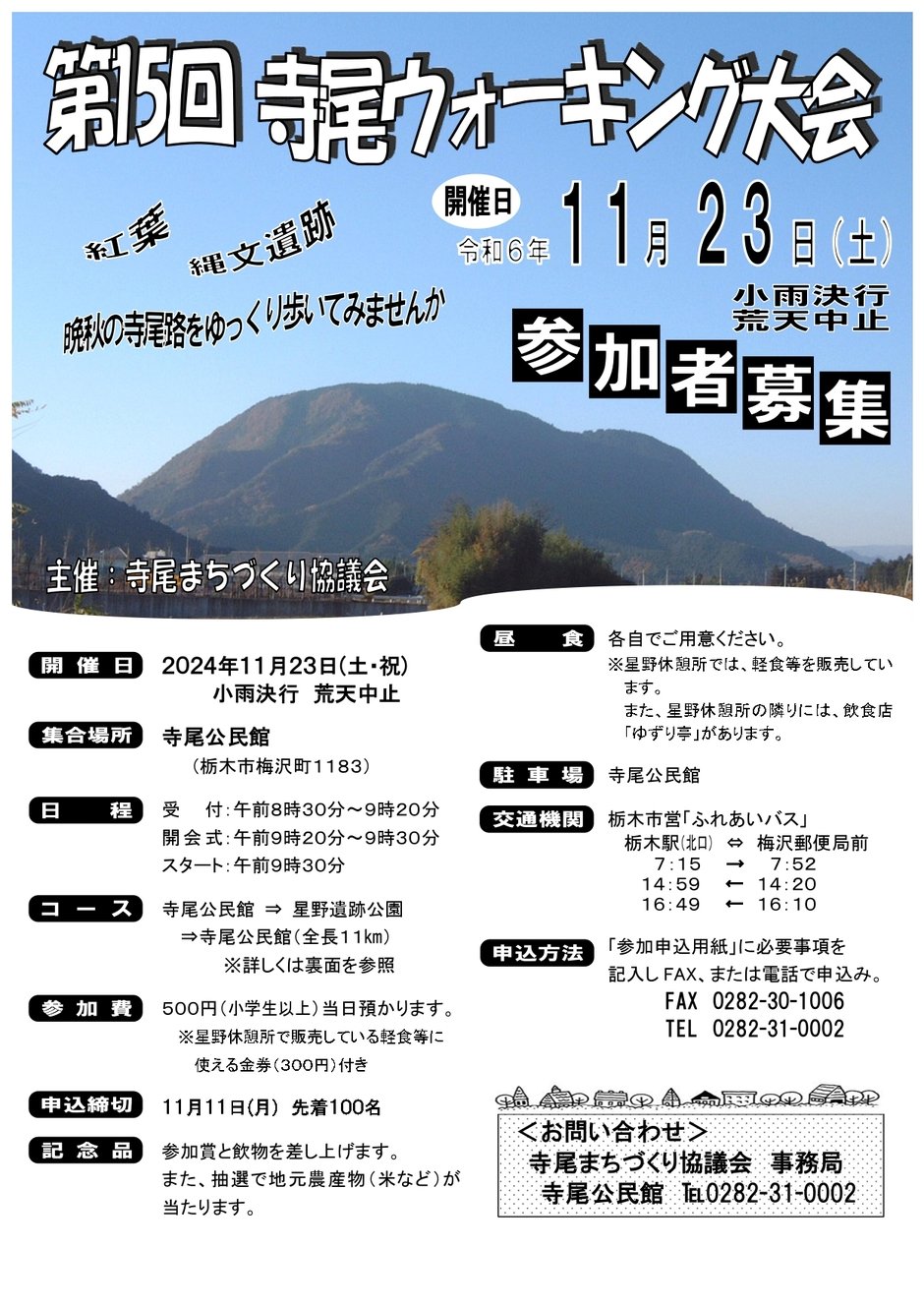 | お問い合わせ | 主催:寺尾まちづくり協議会 事務局:栃木市寺尾公民館 TEL 0282-31—0002 FAX 0282-30-1006 |