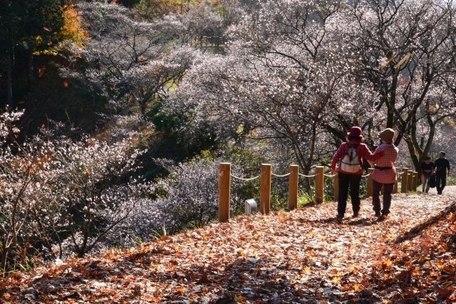 広大な園内に冬桜が約7,000本植栽されており、11月から12月にかけ見ごろを迎える。11月中旬ごろ、紅葉が冬桜に重なり幻想的な眺めが広がる。桜と紅葉が一枚の写真に納まる場所は珍しく、カメラ愛好家にも人気のスポット。春と冬に咲く「二度咲き」の冬桜は国指定名勝及び天然記念物に指定されている。