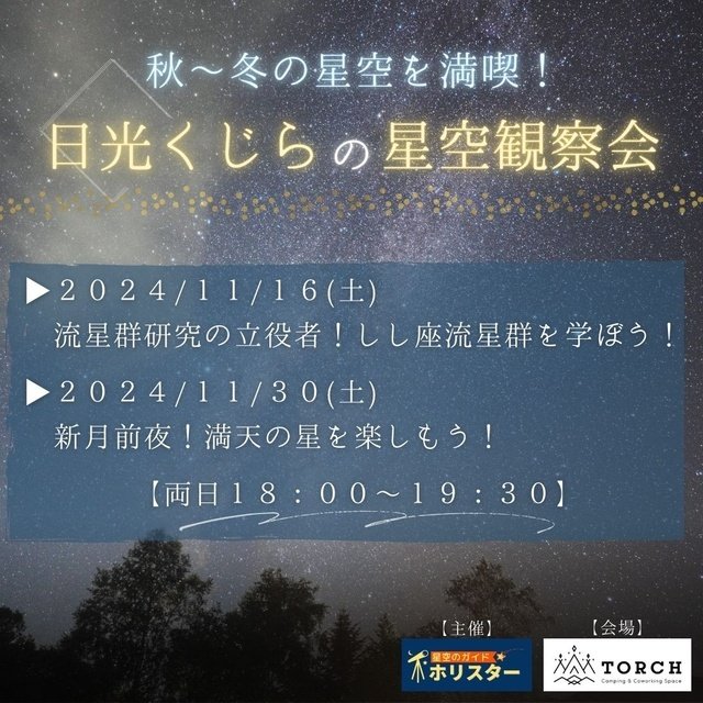 開催日時備考:開催日は11/16・30。17:30から受付開始。荒天時中止。小雨曇天時は星空レクチャーに振り替え。