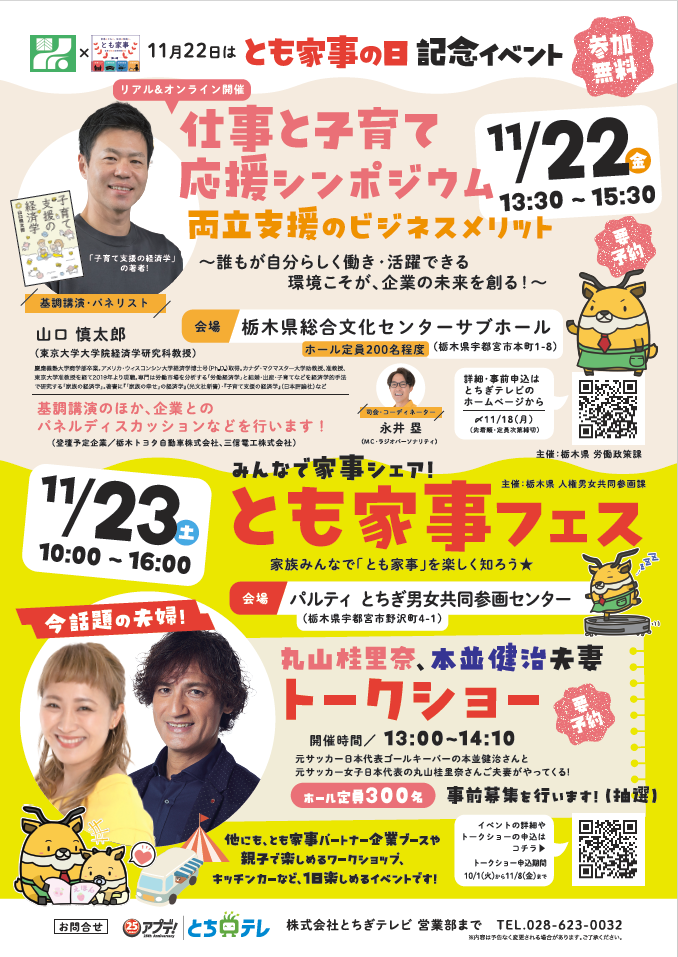 栃木県独自の「とも家事の日(11月22日)」に合わせ、家族みんなで「とも家事」を楽しく知ることができるイベントを開催します。