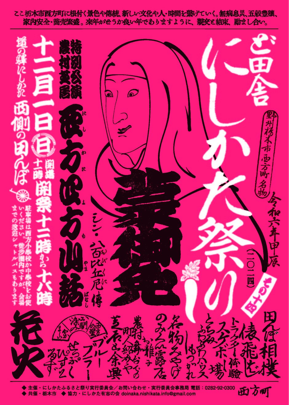 栃木市西方地域で最大のイベントである「ど田舎にしかた祭り」は、地域の農業、商業、工業関係の若者たちが中心となって立ち上げたお祭りで、今年で14回目となります。江戸時代まで農民の娯楽として行われていたとされる農村歌舞伎の舞台を田んぼ上に再現し、舞台上では、迫力ある和楽器隊による演奏パフォーマンス等を予定しています。その他会場内では様々なブースを用意します。