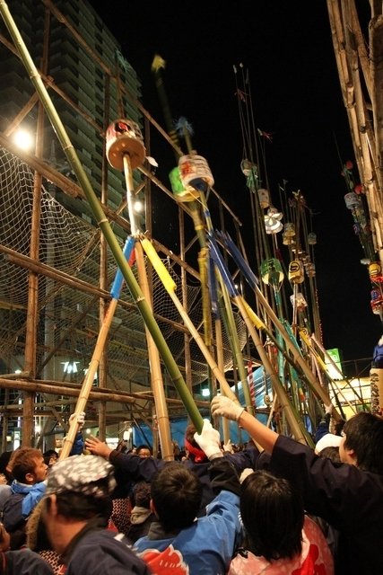 竹竿の先につけた提灯の灯を消そうと竹竿を激しくもみ合う祭りで「関東の奇祭」と言われている。