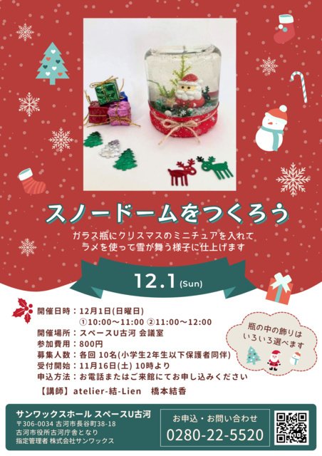 ガラス瓶にクリスマスのミニチュアを入れて、ラメを使って雪が舞う様子に仕上げる。瓶の中のクリスマス飾りは好きなものから選べる。小学2年生以下は保護者同伴。定員は各回10人(先着順)。申し込みは11月16日(土)10時より電話又は来館にて。講師:atelier-結-Lien 橋本結香。