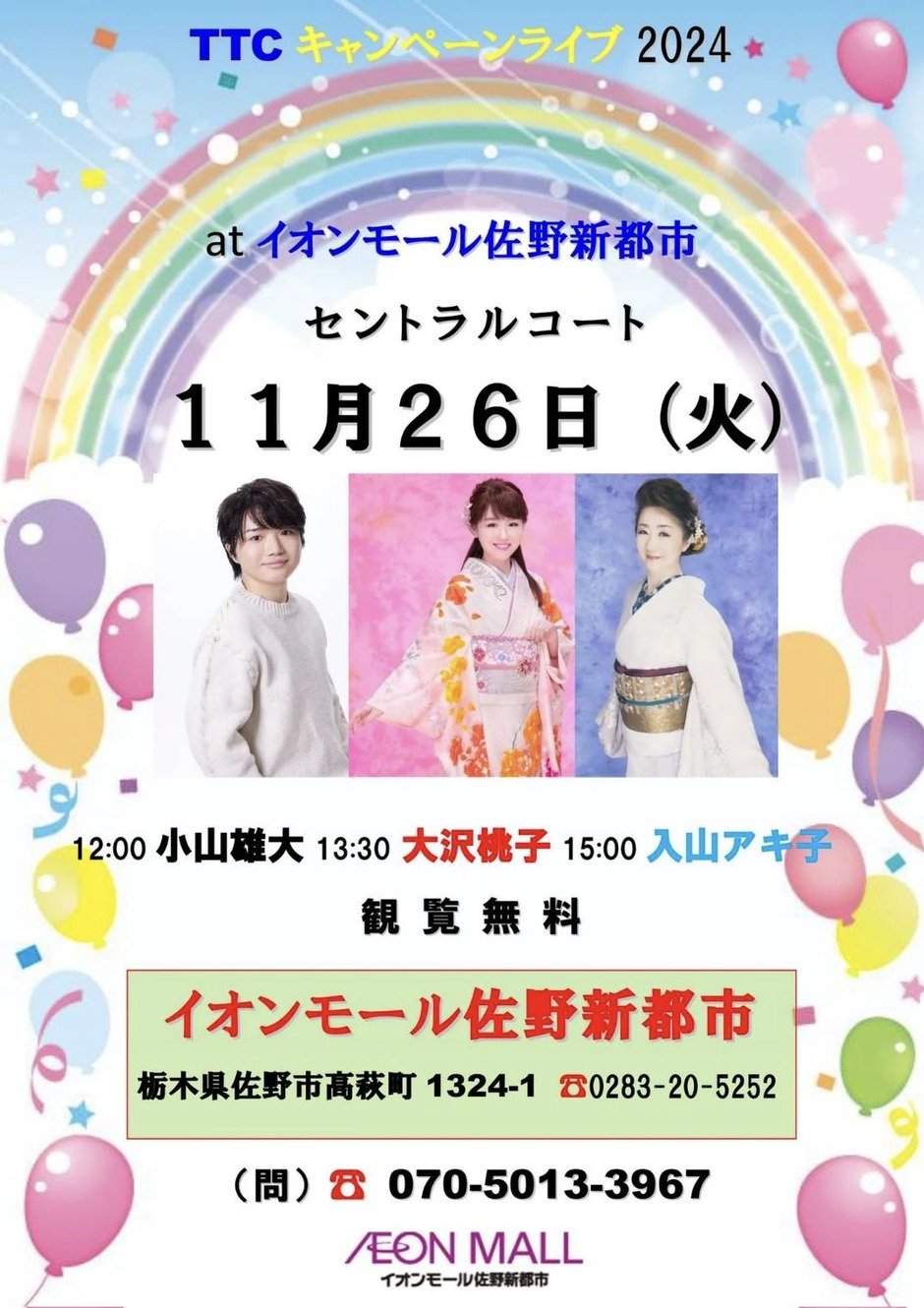| 時間 | ・小山雄大 12:00〜 ・大沢桃子 13:30〜 ・入山アキ子 15:00〜 |