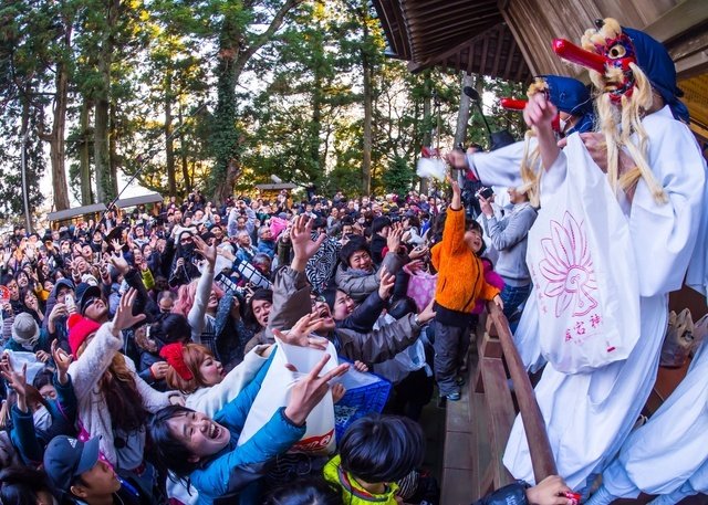 13人が白装束で天狗の格好をし、16ヶ所の祠(ほこら)にお供え物をして回る。この時に、参詣者が天狗に向かって悪態を吹いて、お供え物を奪い合うという変わったお祭り。そのお供え物を持ち帰ると、「無病息災」・「家内安全」・「五穀豊穣」のご利益があり、悪口をもって相手を言い負かすと幸運をもたらすともいわれている。