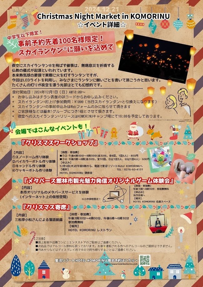 里沼リゾートホテルKOMORINUと南側のキャンプ場西広場で、クリスマスナイトマーケット【食とアートのまちイルミネーション】を開催します。イルミネーションとスカイランタン®、アートイベントやグルメも楽しめます!ぜひお越しください。