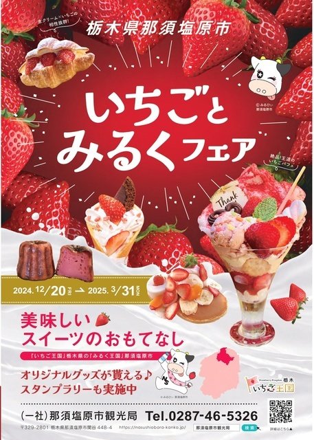 いちごとみるくで美味しいスーツのおもてなし。緑豊かな大地と清らかな水で育まれた那須塩原を代表する「いちご」と「牛乳」。この時季、市内の宿、飲食店には新鮮な「いちご」と「牛乳」を使ったオリジナルスイーツがいっぱい!お気に入りの「いちごとみるく」スイーツを探してみよう。宿泊券が当たるスタンプラリーも開催!