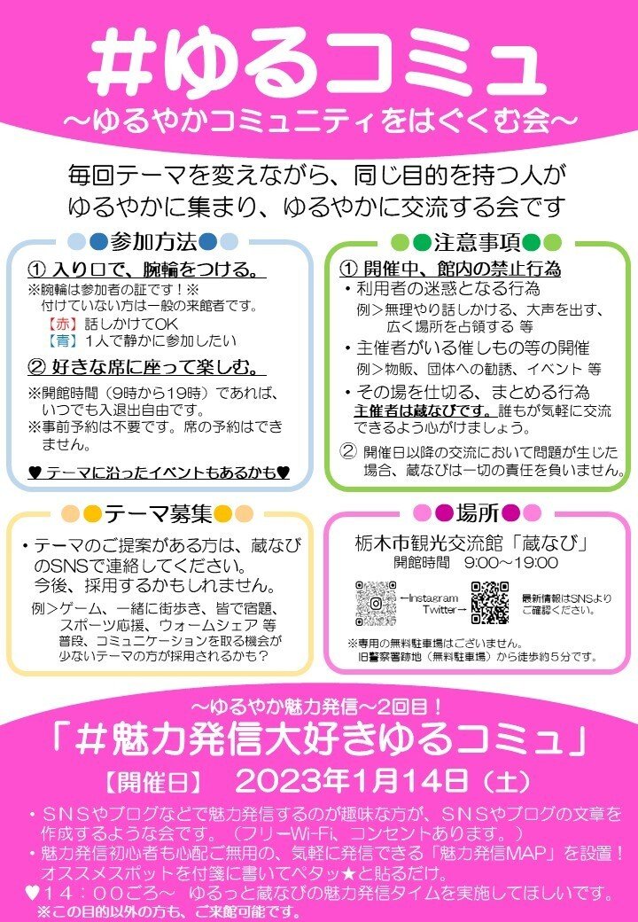 栃木市観光交流館「蔵なび」は、観光案内、特産品の展示、観光情報等の発信及び多目的交流を行うとともに、本市の魅力を広く発信する等の総合的シティプロモーション機能を持った新たな観光拠点施設として、魅力・活力・賑わいの創出を目指して設置されました。