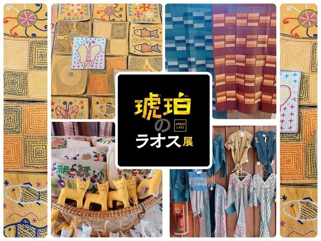 ラオス展、群馬初開催! 青のラオス展、赤のラオス展、深緑のラオス展に続き「琥珀のラオス展」を開催。ラオスの手織り、草木染め、民族刺繍の布雑貨、ハーブティー、自然色のチョコレートなどが並ぶ。