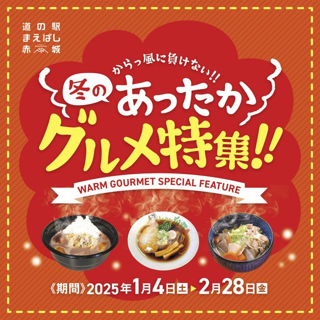 道の駅まえばし赤城で楽しむ、冬のあったかグルメ特集! みなさんはどのメニューを食べたかな? あなたのお気に入りのメニューを見つけよう! イルミネーションを見た後は、あったかグルメを召し上がれ!