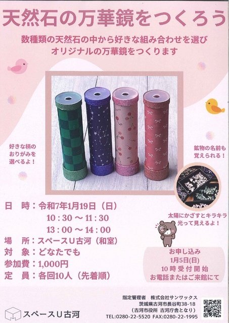 数種類の天然石の中から好きな組み合わせを選んで天然石の万華鏡をつくる。太陽にかざすとキラキラ光って見える。申込は1月5日(日)10時よりTEL(0280-22-552)または来館にて。小学2年生以下は保護者同伴。