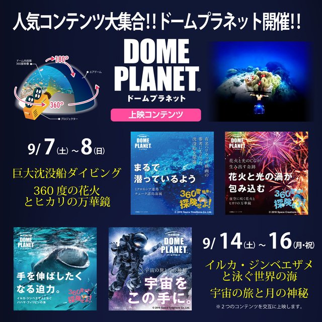 地球上の様々な自然・生き物・文化を360度映像で切り取り届けるドームプラネットを開催! 巨大なエアドームの中で360度の映像を見ることで、まるでその場にいるかのような体験ができる。今回は2週連続開催。毎週コンテンツを入れ替え、2つのコンテンツを交互に上映する。