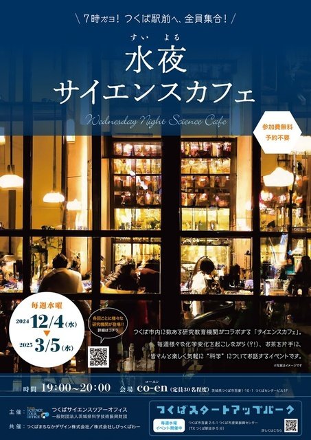 昨年始まった、茨城県つくば市内に数ある研究教育機関がコラボして話題をお届けするサイエンスカフェ。本年度は「水夜(すいよる)」として、毎週水曜日の夜に開催!各回色々な研究機関がタッグして、様々な化学変化を起こす!お茶を片手に、気軽に科学を楽しんでみてはいかが?参加無料、予約不要。
