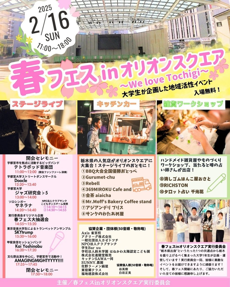 栃木を盛り上げたい!というたった1つの共通点から繋がった大学1年生5人がゼロから企画しました!大好きな栃木に根差した大きなイベントをやろう!ということから企画が始動し、JR宇都宮駅西側の賑わいスポットである市民交流広場「オリオンスクエア」を舞台に2025年2月16日(日)に《春フェスinオリオンスクエア ~We love Tochigi~》を開催することになりました!このイベントでは、県内で活躍する音楽バンドやダンスパフォーマンスのステージライブが会場を彩り、キッチンカーの飲食ブースや雑貨販売・ワークショップなどの体験型ブースもご準備しております!若い世代からシニア世代までどなた様も楽しめるイベントとなっておりますので、ぜひお越しください!