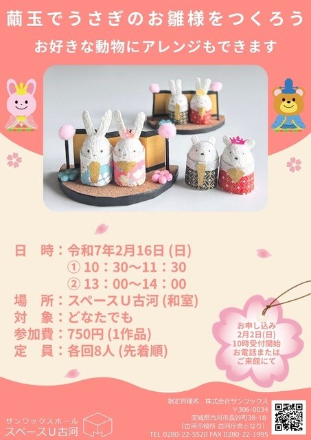 まゆ玉や千代紙でかわいいうさぎのおひな様を作る。好きな動物にアレンジも可能。申し込みは2月2日(日)10時より電話または窓口にて。