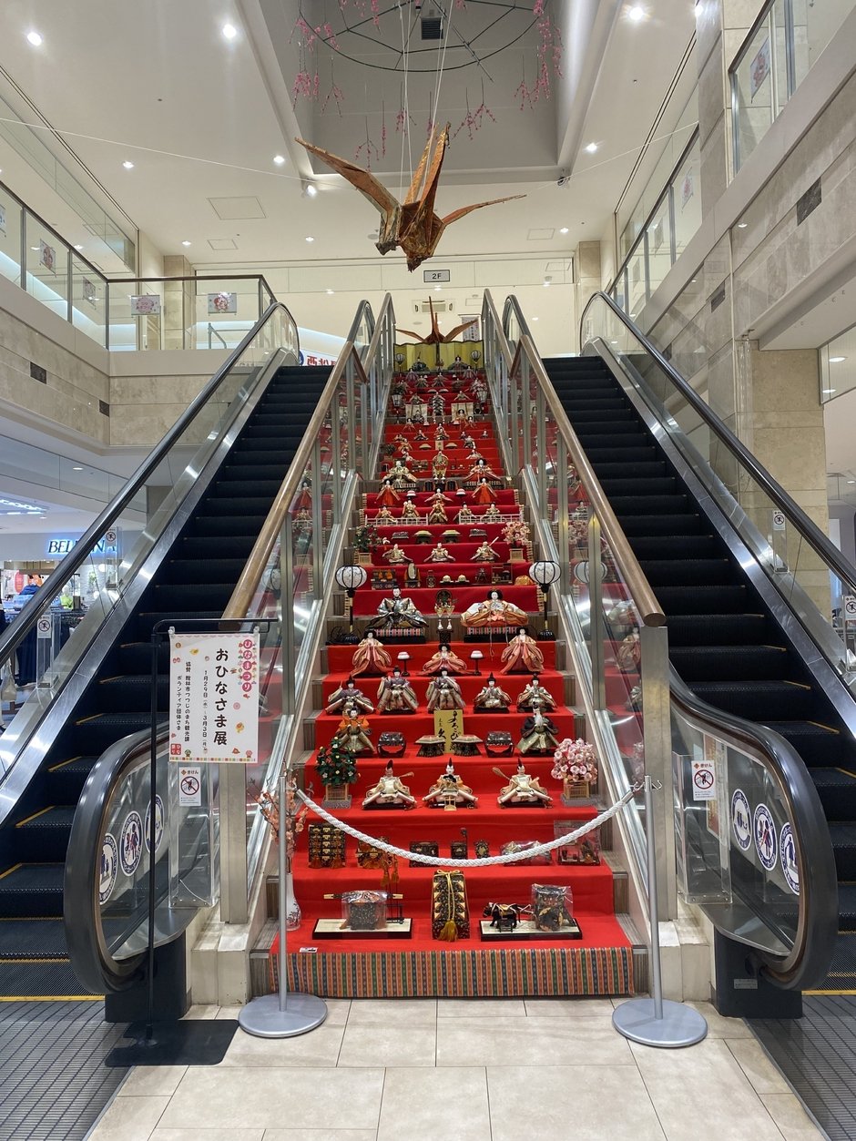 アゼリアモールでは2012年より、毎年ボランティアの方にご協力いただき、市内から寄付いただいたおひなさまを様々な形でアゼリアモール内に展示をしてきました。近年、ご家庭でおひなさまを飾る機会も少なくなりつつあり、地域の方々に、おひなさまを間近でみていただきたいという思いから、館林市とボランティアの方々と一緒に考え、今年は初の取り組みとして、おひなさま4基をアゼリアモール1階三越前の階段に飾り、迫力あるおひなさま展を開催しています。太田市の(有)マインド様にもご協力いただき、折り鶴がおひなさま上空に浮かんでいます。例年とは形を変えた圧巻のアゼリアモールのおひなさま展をぜひご覧ください。
