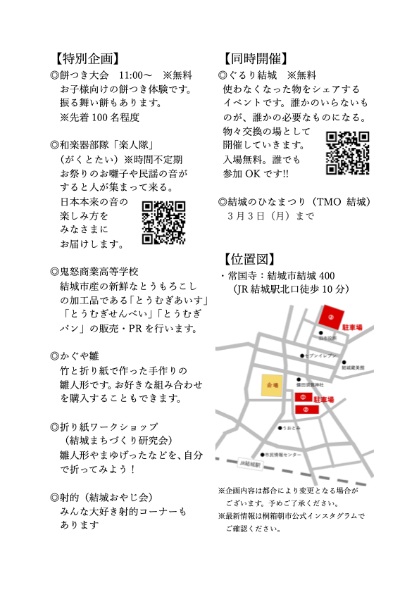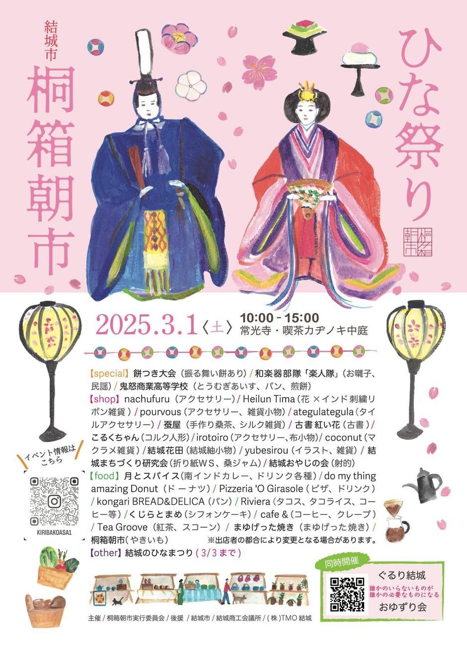 今年も、雛人形たちが結城の街を彩る「結城のひなまつり」に合わせ、常光寺などを会場に『桐箱朝市』を開催いたします。