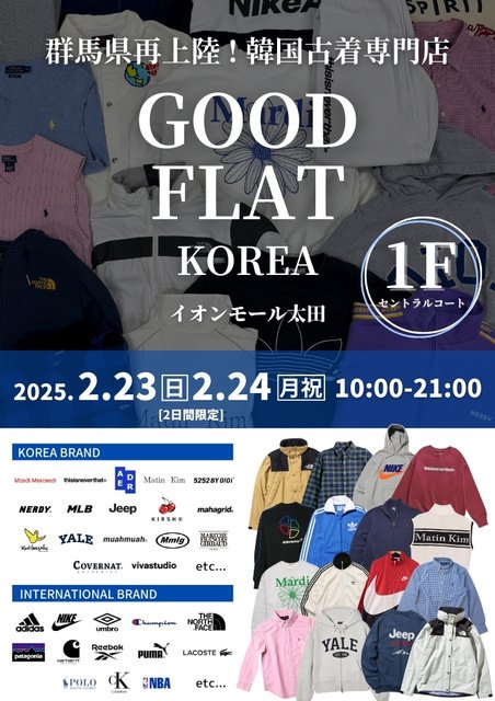 GOOD FLAT-KOREA-(グッドフラットコリア)は日本初の『韓国古着専門店』。日本人バイヤーが、日本で流行している最新のファッショントレンドを取り入れ、日本人の好みにあったセレクトを現地で行っている。ただの古着店ではなく、日本の流行トレンド×韓国古着をミックスしたハイブリットなコーディネートの提案や韓国カルチャーの発信をしている。イオンモール太田にて2日間限定のポップアップストア開催。