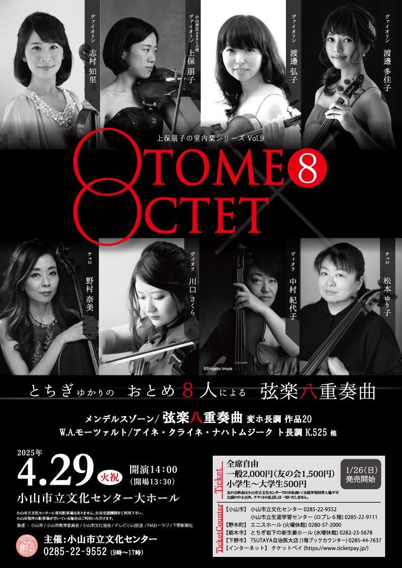 とちぎゆかりの女性8名による弦楽八重奏曲をお楽しみください♪