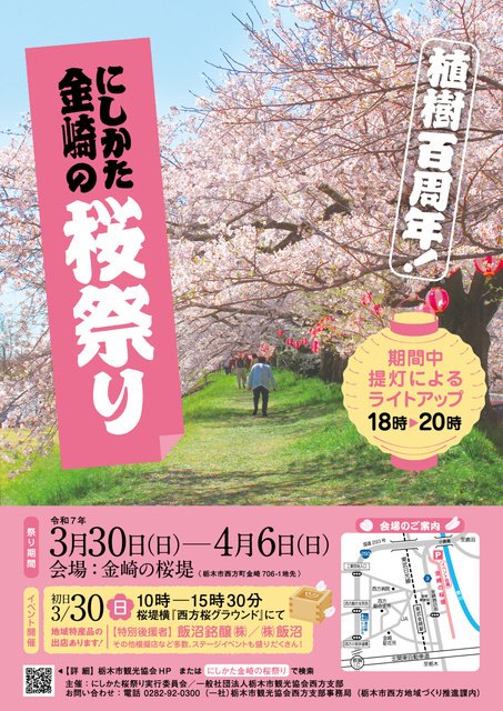 大正14年(1925年)、当時の皇太子(昭和天皇)のご成婚を記念して金崎青年団によって植えられた「金崎のさくら」。桜が満開となる姿は、風情をたっぷり。天気の良い日には、思川の土手沿いに続く約200本の桜並木から、日光連山を望むことができる。祭り期間中は桜のライトアップを実施。灯りに照らされた夜桜を楽しもう。イベント日の3月30日には、ステージ、模擬店(地元団体の出店)等、楽しい企画が盛りだくさん!