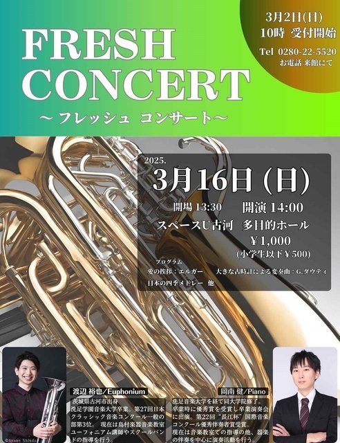 古河市にゆかりのある若手音楽家応援企画。ユーフォニアムとピアノのデュオで一度は聴いたことのある曲目でのフレッシュコンサートを開催。子どもも参加できるクラシックコンサート。