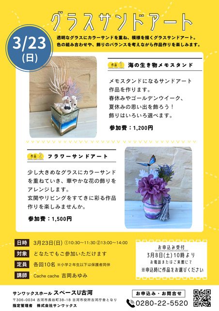 透明なグラスにカラーサンドを重ね、模様を描くグラスサンドアート。色の組み合わせや飾りのバランスを考えながら作品作りを楽しむことができる。海の生き物メモクリップとフラワーサンドアートの2種類から選べる。小学2年生以下は保護者同伴。定員は各回10人(先着順)。申し込みは3月8日(土)10時より電話又は来館にて。講師:吉岡あゆみ。