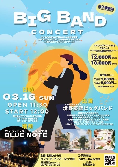 群馬県太田市でビッグバンドによる迫力あるJAZZ生演奏を聞きながら、ミシュラン星付きシェフ監修の食事が楽しめるスペシャルランチコンサート。斑尾高原や宇都宮のジャズフェスティバル、高崎音楽祭でも大人気の『境野英師ビッグバンドメンバー』が太田市に初上陸! 高崎キングオブパスタ出場の今大人気のパスタや子供用キッズスペースや子供メニューも有。家族連れも楽しめるよう特別ジブリメドレーも演奏。
