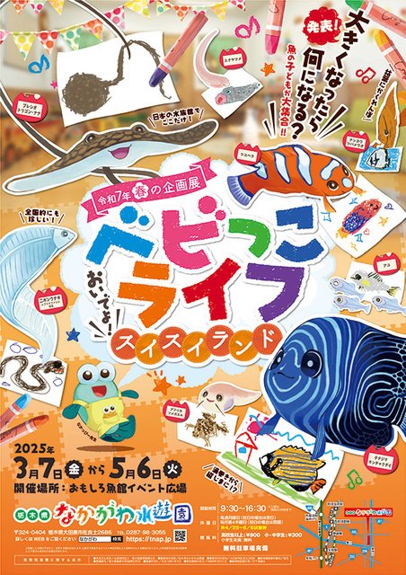 魚の子どもをテーマにした春の企画展。成長とともに形や色合いが大きく変わる生き物たちにスポットをあて、その独特な生態や生き残るための術などを紹介している。幼稚園風の会場に、アユやサケなど馴染みのある魚の子どもや、普段目にする姿とは大きなギャップがある魚の子どもたち約22種200匹が展示される。