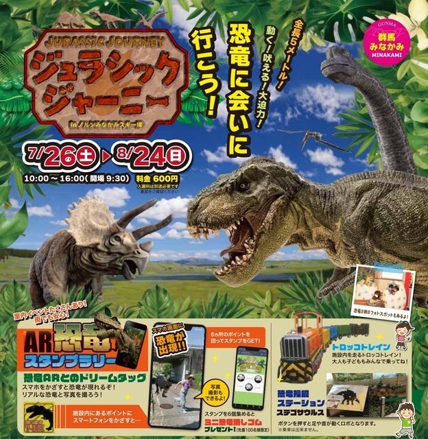 夏のスキー場に巨大な動く恐竜が出現!全長5mの恐竜たちが吠え、迫力満点。操縦ステーションではステゴザウルスを簡単操作、トロッコトレインで施設内を巡ろう。さらに、スマホを使ったAR恐竜スタンプラリーで6か所を回り、リアルな恐竜と写真撮影!同時開催の「ウォーターランド」では水遊びで涼しさ満喫(別途400円/回)。この夏、恐竜と冒険しながら思い出を作ろう!