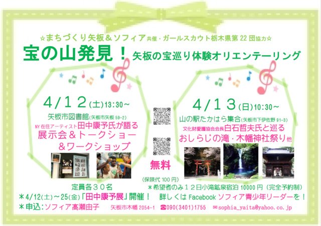 12日(13:30~)はNY在住アーティスト田中康予氏展覧会&無料トークショー(17:00~)が行われる。場所は矢板市立図書館。小滝鉱泉宿泊会:NY在住漢方医メイ氏医学相談会&康予氏白石氏との座談会。13日(10:30~)は、文化愛護協会会長白石哲夫氏案内にて、おしらじの滝、木幡神社のお祭りなどを見学する(山の駅たかはら集合)。宿泊無しでの参加自由。