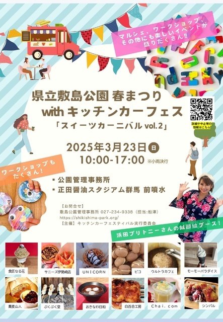 県立敷島公園にて春まつりを開催。キッチンカー12台が出店しスイーツを販売される。そのほかにも、タレントの浜田ブリトニーさんによる似顔絵ブースやミニ張り子だるまの和紙貼り体験等のワークショップやマルシェも開催される。