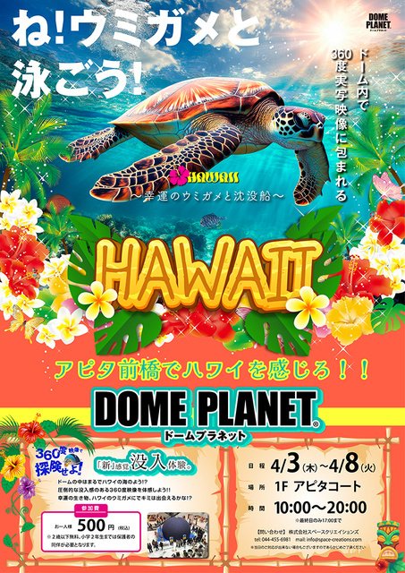 360度地球体験型アトラクション「ドームプラネット」と、人気観光地「京都」の銘菓や名産品を集めた「京都物産展」をアピタ前橋にて同時開催。ドームプラネットでは巨大なエアドームの中で360度の映像を見ることで、まるでその場にいるかのような体験ができる。今回は最新作「ハワイ~幸運のウミガメと沈没船~」を上映する。幸運の生き物・ウミガメを探してハワイの海に潜ろう。