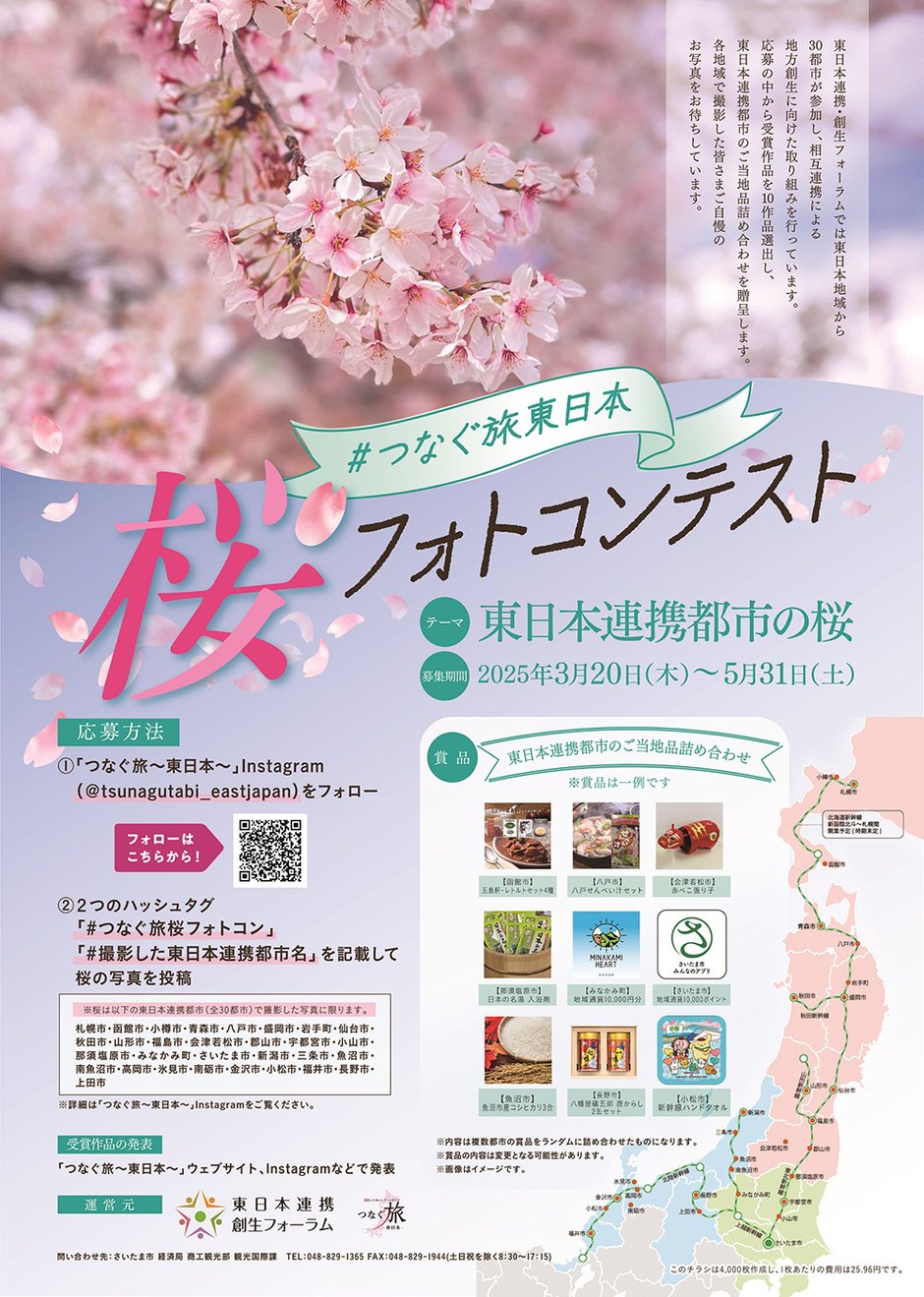 東日本地域の30都市との広域連携を通じて「ヒト・モノ・情報」の対流を生み、東日本地域の地方創生に取り組んでいる東日本連携・創生フォーラムでは、「桜」をテーマにInstagramでフォトコンテストを開催します。桜前線とともに北上する各都市の春の訪れを追いかけてみませんか。