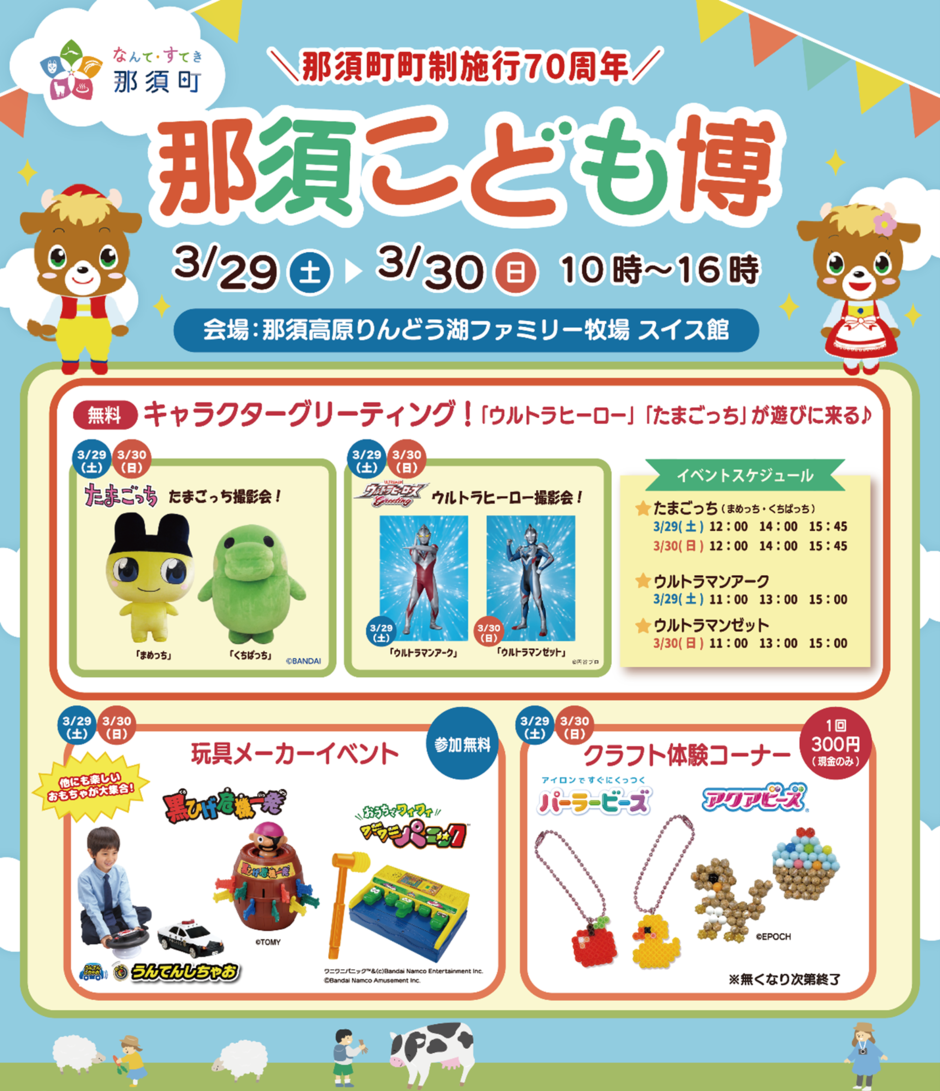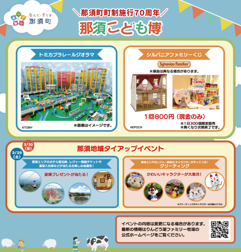 那須町町制施行70周年を記念し、一般社団法人 日本玩具協会と那須地区ホテル&レジャー施設連絡協議会、那須高原りんどう湖ファミリー牧場が共同主催のお子様向けイベント「那須こども博」を開催いたします。70周年のフィナーレを飾るイベントとして、那須町民の皆様と観光のお客様に喜んでいただける、玩具メーカーの様々なおもちゃコーナーや、地元施設とのタイアップイベントなど楽しいイベント盛りだくさんです!