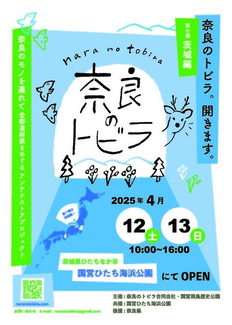 奈良の「産品」と「情報」を全46都道府県に届けるアンテナストアプロジェクト「奈良のトビラ」茨城編。奈良の特産品販売だけでなく、国営飛鳥歴史公園50周年を記念し、パネル展示や、VRを用いたバーチャル飛鳥京体験、飛鳥の粘土ワークショップ体験などがある。