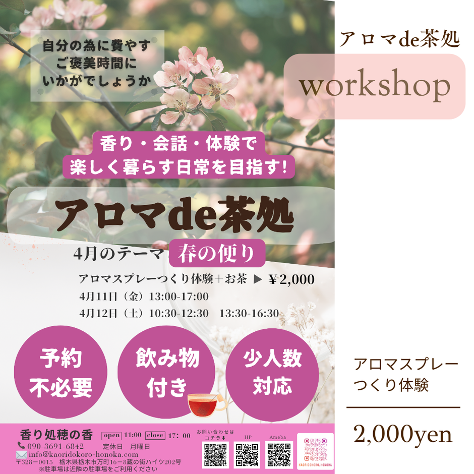 2025年4月のアロマde茶処(天然成分のアロマを調香してアロマスプレーを創る体験)テーマは春の便り
