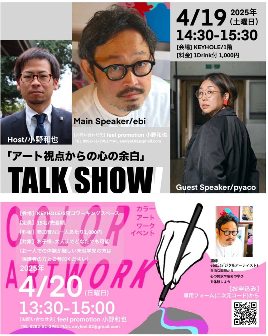■ トークショー『アート視点からの余白』 ebiさんをお迎えし、「アート×余白」をテーマに語り合うトークイベントを開催します。 作品に込められた想いや、“余白”が日常にもたらすものについて、 アートの視点からゆるやかに紐解いていく時間です。 ・日程:2025年4月19日(土) ・時間:14:30〜15:30 ・参加費:1,000円(1ドリンク付き) ・定員:なし(ご予約不要・どなたでも参加可能) メインスピーカー/ebi (デジタルアーティスト) ゲストスピーカー/ぴゃこ 司会/小野和也(ebiマネージャー/feel promotion)