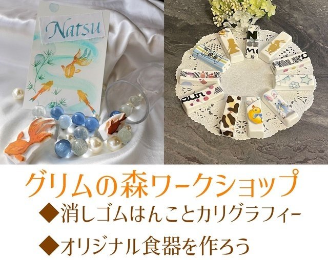 | 参加費 | 消しゴムはんことカリグラフィー2,500円、手作り食器1,800円 |