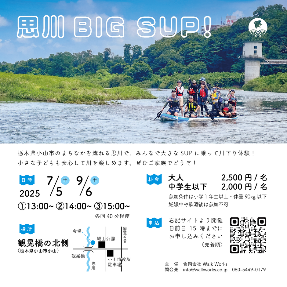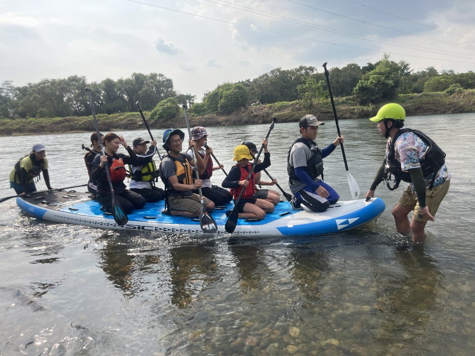 栃木県小山市のまちなかを流れる思川で、みんなで大きなSUPに乗って川下り体験。小さな子どもも安心して川を楽しめます。ご家族や、ご友人、職場仲間と一緒にぜひ!