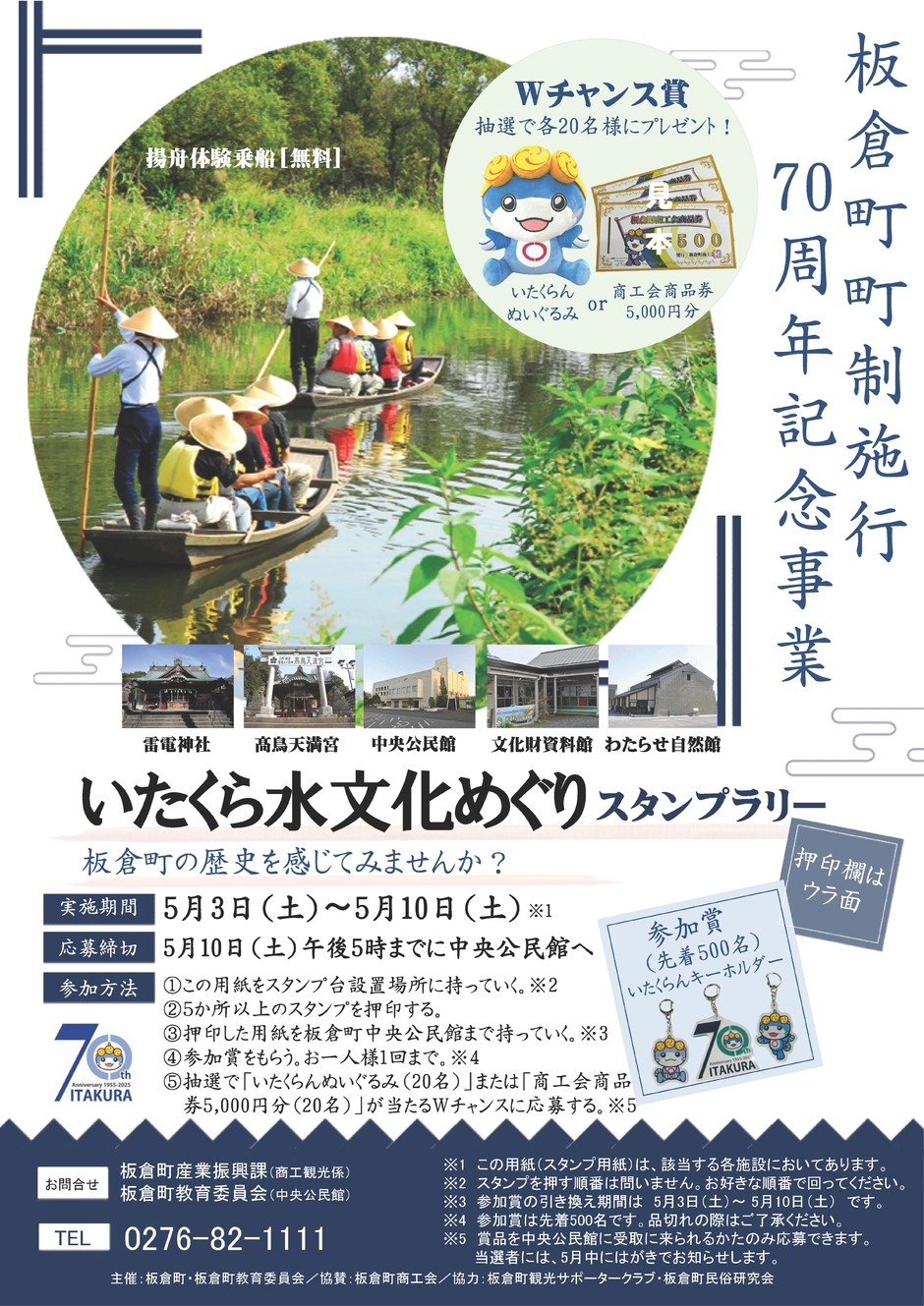 板倉町町制施行70周年を記念して、町内6か所で先人達が残した文化などの見学や体験を通して、町の歴史を感じることができるスタンプラリーを実施します。無料の揚舟体験乗船をはじめ、高瀬舟や農具の展示、特別企画展など、板倉の文化がつまったスタンプラリーに、ぜひご参加ください。