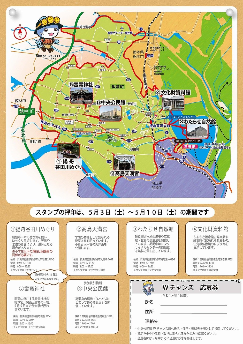 4.抽選で、いたくらんぬいぐるみ(20名様)または板倉町商工会商品券5,000円分(20名様)が当たるWチャンスに応募する。当選者には、5月中にはがきでお知らせします。