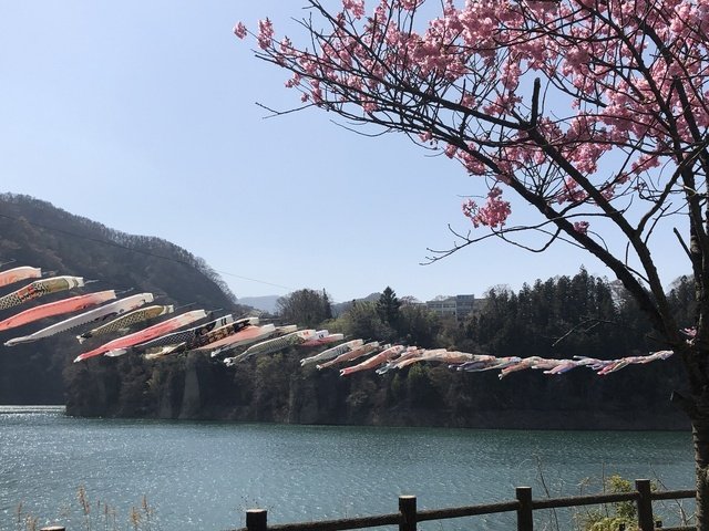 赤谷湖上を爽やかな風を受けて大空を泳ぐ鯉のぼり! 赤谷湖周辺に咲く桜とともに湖面を鯉のぼりが元気に泳ぐ姿は、みなかみ町の春の風物詩となっている。また、家庭などで使われなくなった鯉のぼりを、猿ヶ京温泉の日帰り温泉施設「まんてん星の湯」まで届けた人には、まんてん星の湯入浴券を進呈。