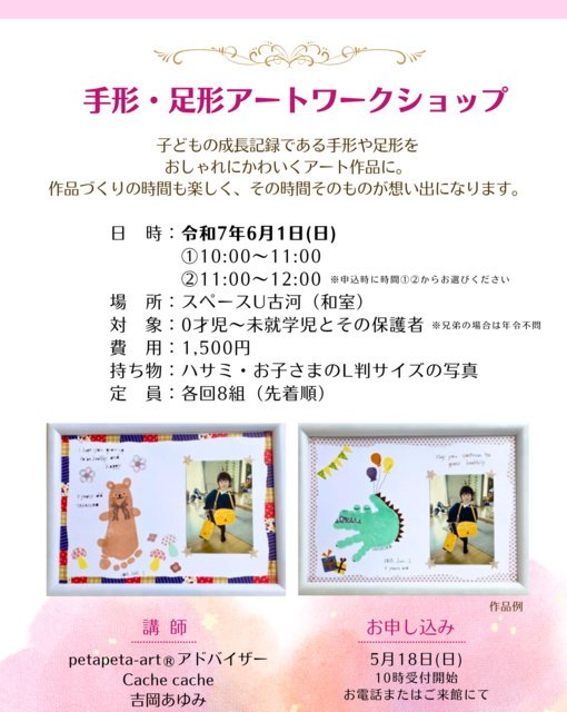 こどもの成長記録である手形や足形でかわいい作品を作る。作品作りの時間も楽しく、その時間そのものが想い出になる。自由製作も可能。作品はA4サイズ(フレーム付き)。持ち物はL版サイズの子どもの写真・ハサミ。定員は各回8組(先着順)。申し込みは5月18日(日)10時より電話受付開始(TEL0280-22-5520)