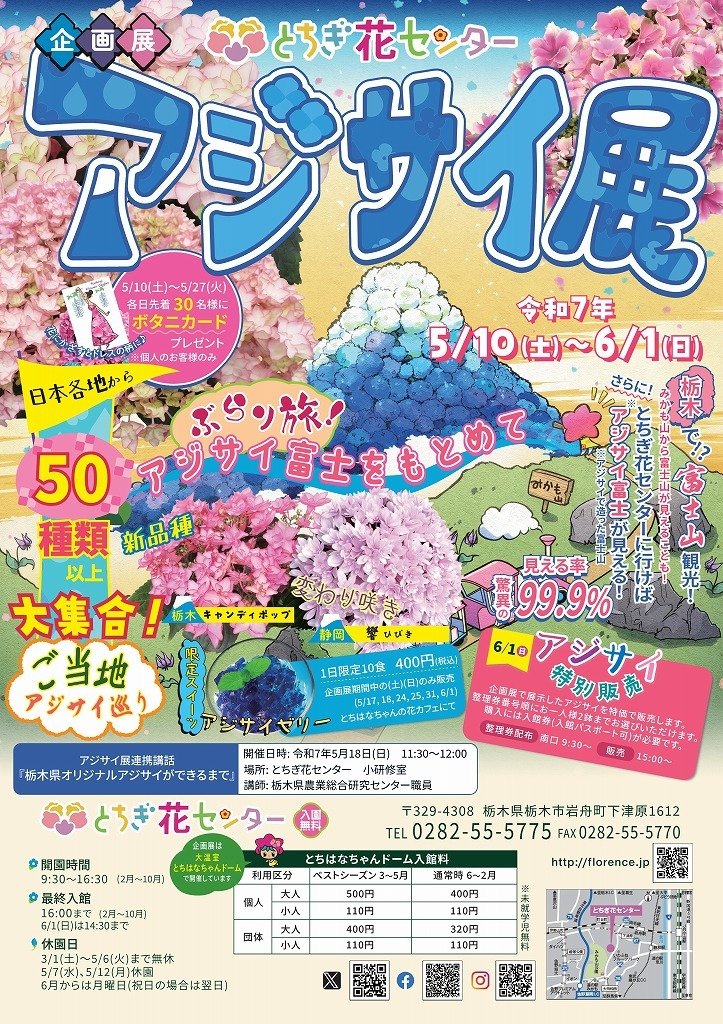 さらに、昨年を上回る250鉢のアジサイを使ったフォトスポットとして、とちぎ花センター隣のみかも山から望む富士山を、色鮮やかなアジサイで再現!鉢植えのアジサイが織りなす絶景をぜひお楽しみください。