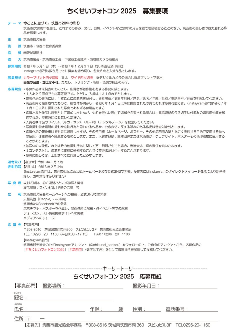 | お問い合わせ | 主催:筑西市観光協会 応募・問合せ先:〒308-8616 茨城県筑西市丙360 スピカビル3F 筑西市観光協会事務局(市商工観光課内) TEL:0296-20-1160 |