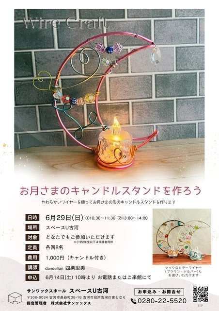 やわらかいカラーワイヤー使ってお月さまの形のキャンドルスタンドを作る。シックな色のワイヤーで大人向けのキャンドルスタンドも作れる。小学2年生以下は保護者同伴。申込は6月14日(土) 10時電話受付開始。